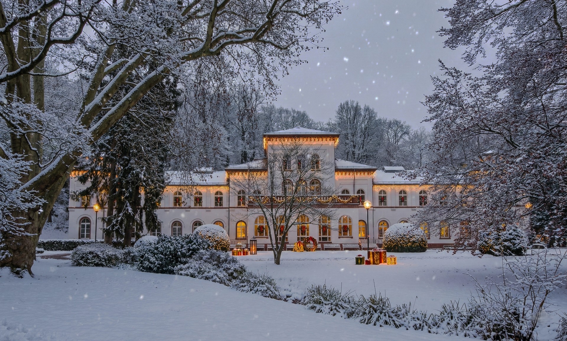 “Create an image in 5:3 aspect ratio : festive christmas atmosphere, warm lights, snow, winter decoration, keep the building recognizable”
