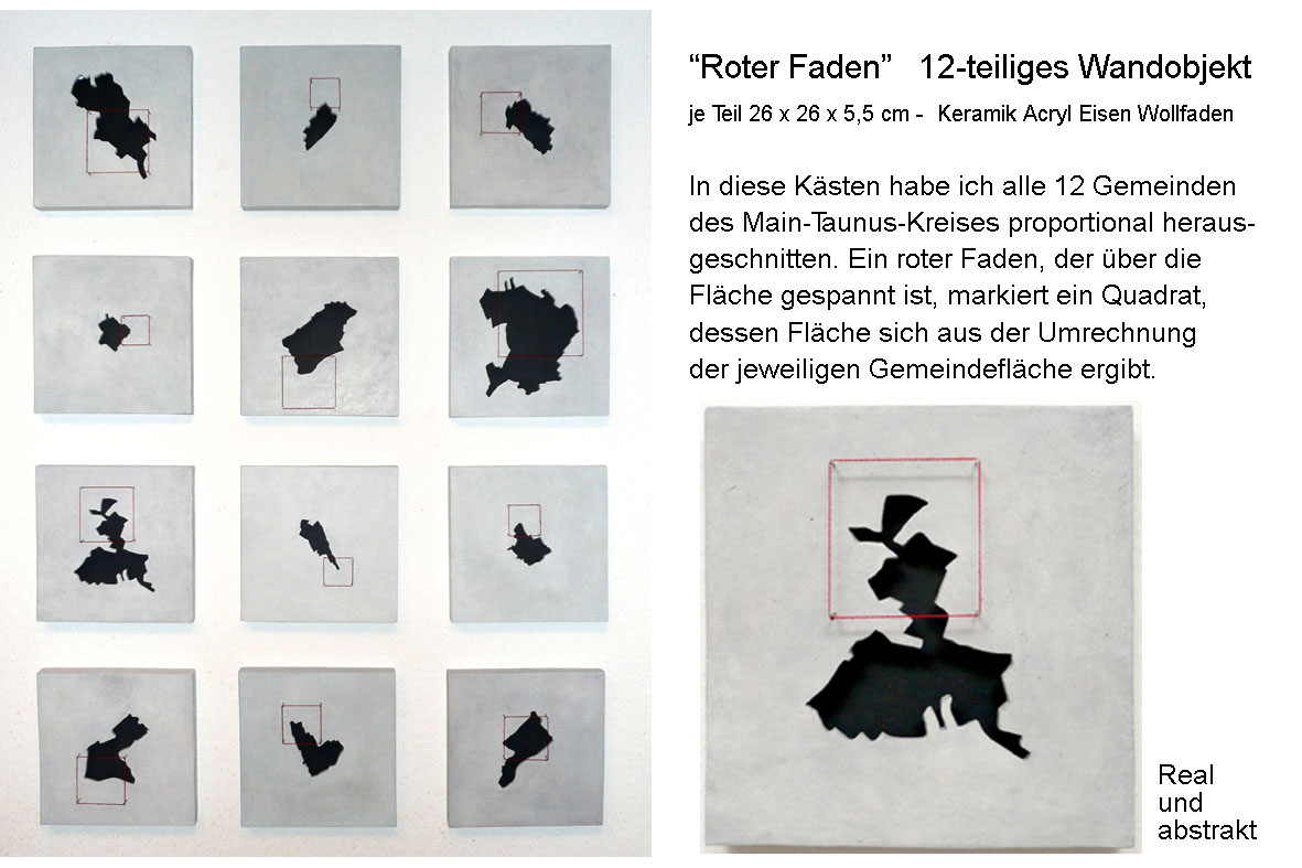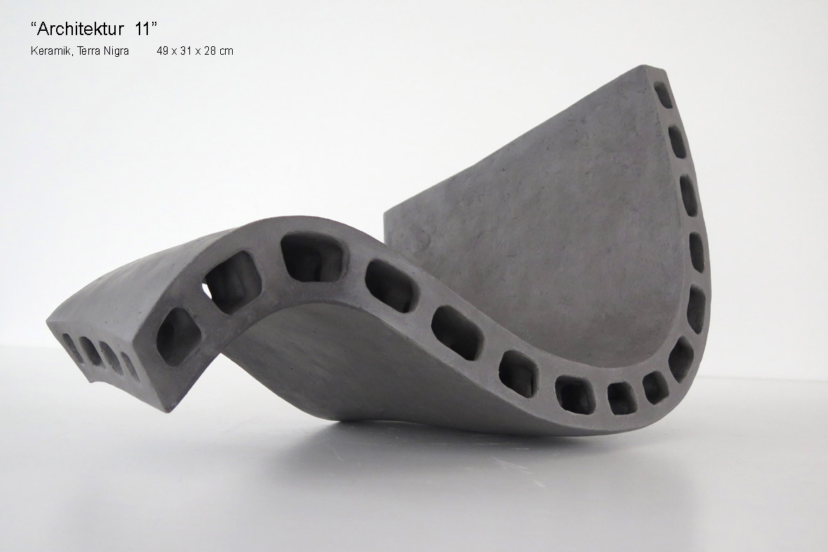 For­ma­le Viel­falt ist mir wich­tig, ob es sich um die Skulp­tu­ren oder um die Bilder han­delt. The­ma­tisch ori­en­tie­re ich mich im wei­te­sten Sinne an Archi­tek­tur / urba­nen Struk­tu­ren, an klaren Formen und Muster unse­rer Welt. Seit ca. 40 Jahren arbei­te ich mit dem fas­zi­nie­ren­den Mate­ri­al Ton. Vor 12 Jahren begann ich meine Fotos sowie Papie­re und Druck­ma­te­ri­al weiter zu be- und ver­ar­bei­ten. Die Kom­bi­na­ti­on des Schwe­ren mit dem Leich­ten, des Groben mit dem Feinen, des Direk­ten mit dem Indi­rek­ten und des Drei­di­men­sio­na­len mit dem Zwei­di­men­sio­na­len ist für mich die Mög­lich­keit der Erwei­te­rung meiner Aus­drucks­wei­se. Meine Formen sind redu­ziert, ver­frem­det, über­la­gert, ver­än­dert, kombiniert.