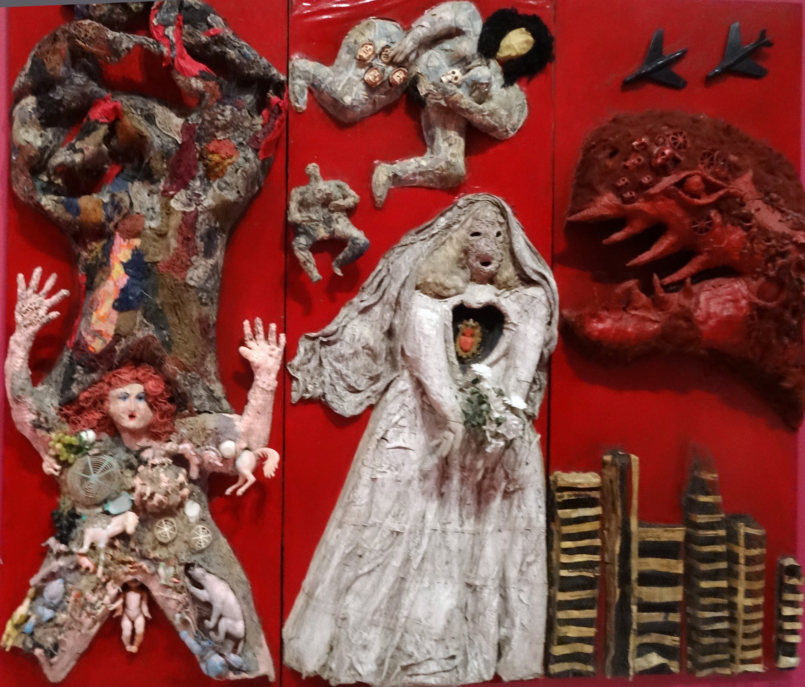 Niki wurde als junges Mäd­chen von ihrem Vater ver­ge­wal­tigt. Dies führte bei ihr zu star­ken Zwei­feln an ihrer Rolle als Frau in der Gesell­schaft. Bei einem the­ra­peu­ti­schen Auf­ent­halt in einer Psych­ia­trie fing sie an, Gegen­stän­de auf Bil­dern zu ver­sam­meln und so asso­zia­ti­ve Aus­sa­gen zu ver­mit­teln. Auf diesem Tryp­ti­chon sind nicht nur Frauen als Gebär­fi­gu­ren, soin­dern auch als Hoch­zeit und Tod durch Krieg ver­sam­melt. All dies waren die gesell­schaft­lich strit­ti­gen Themen damals in den USA.