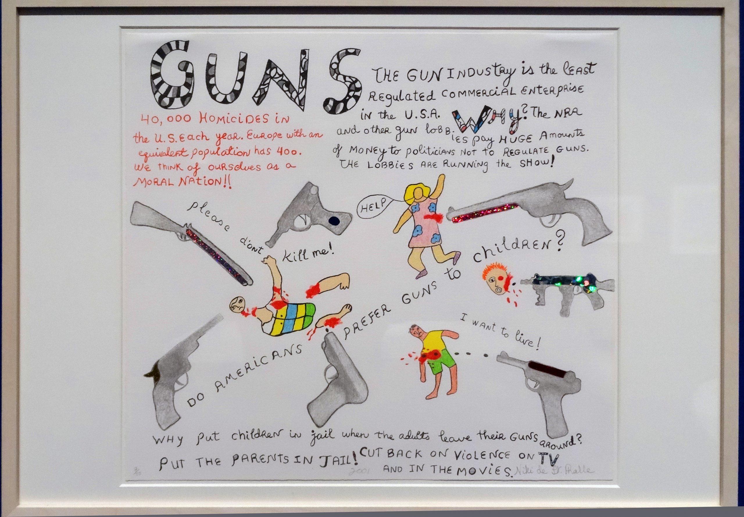 Als ältere Frau zog sie von Europa wieder zurück in die USA und setzte sich dort stark für die Gemein­schaft ein. Sie ver­such­te, mit ihren Mit­teln Bot­schaf­ten für eine bes­se­re Welt wei­ter­zu­ge­ben. Hier ist ein Bild gegen die Waf­fen­lob­by in den USA.