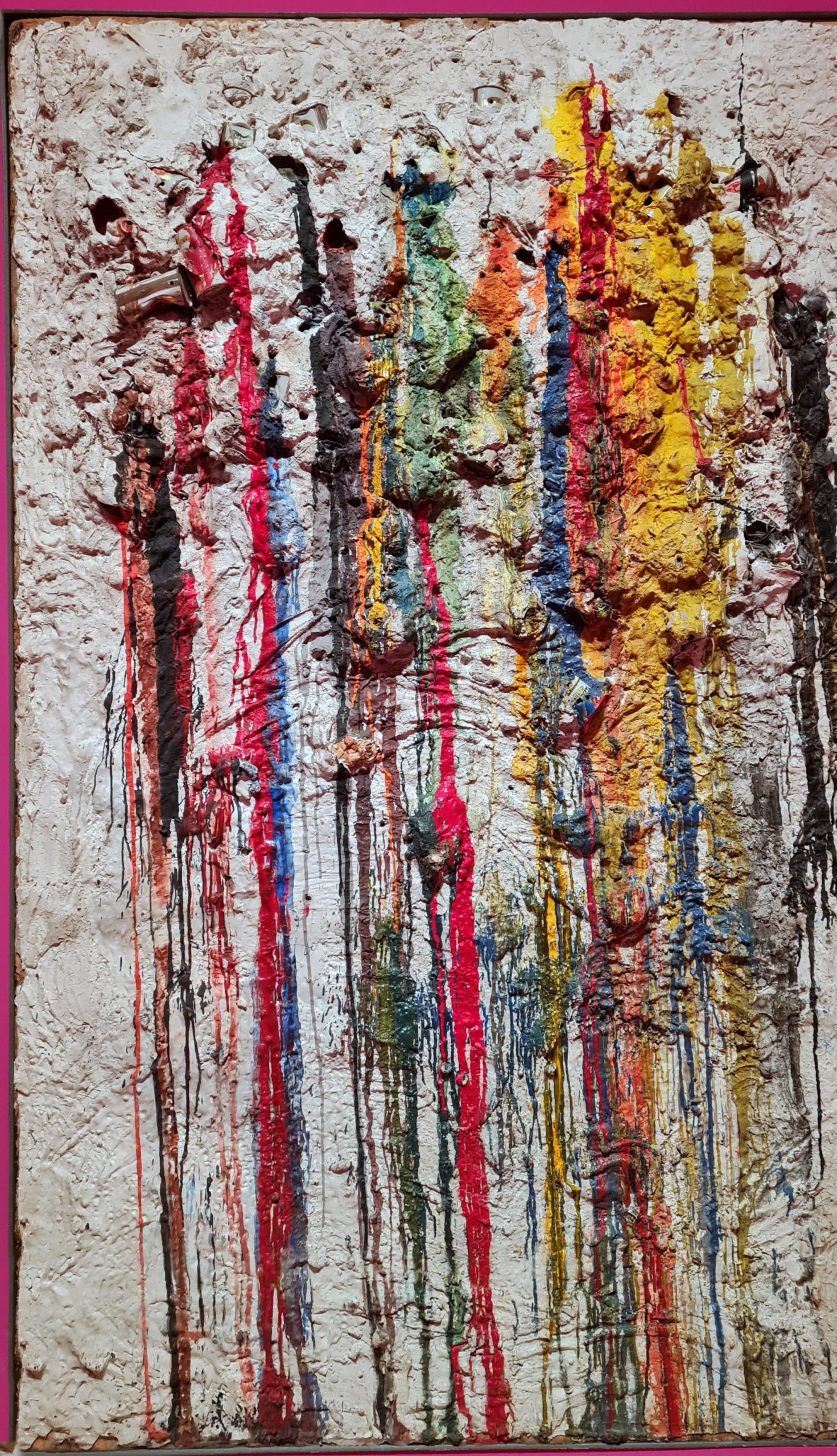 Niki wurde in den USA 1930 gebo­ren, in eine Zeit, in der Frauen nicht viel zu sagen hatten. Erst mit den Schieß­bil­dern fand sie damals als ein­zi­ge Frau Ein­gang in den exklu­si­ven Eli­ten­kreis der Künst­ler. Bei diesen Bil­dern werden Farb­do­sen in Gips­bil­der ein­ge­las­sen und dann vom Besu­cher mit einem Gewehr beschos­sen, so dass die Farbe herausläuft.