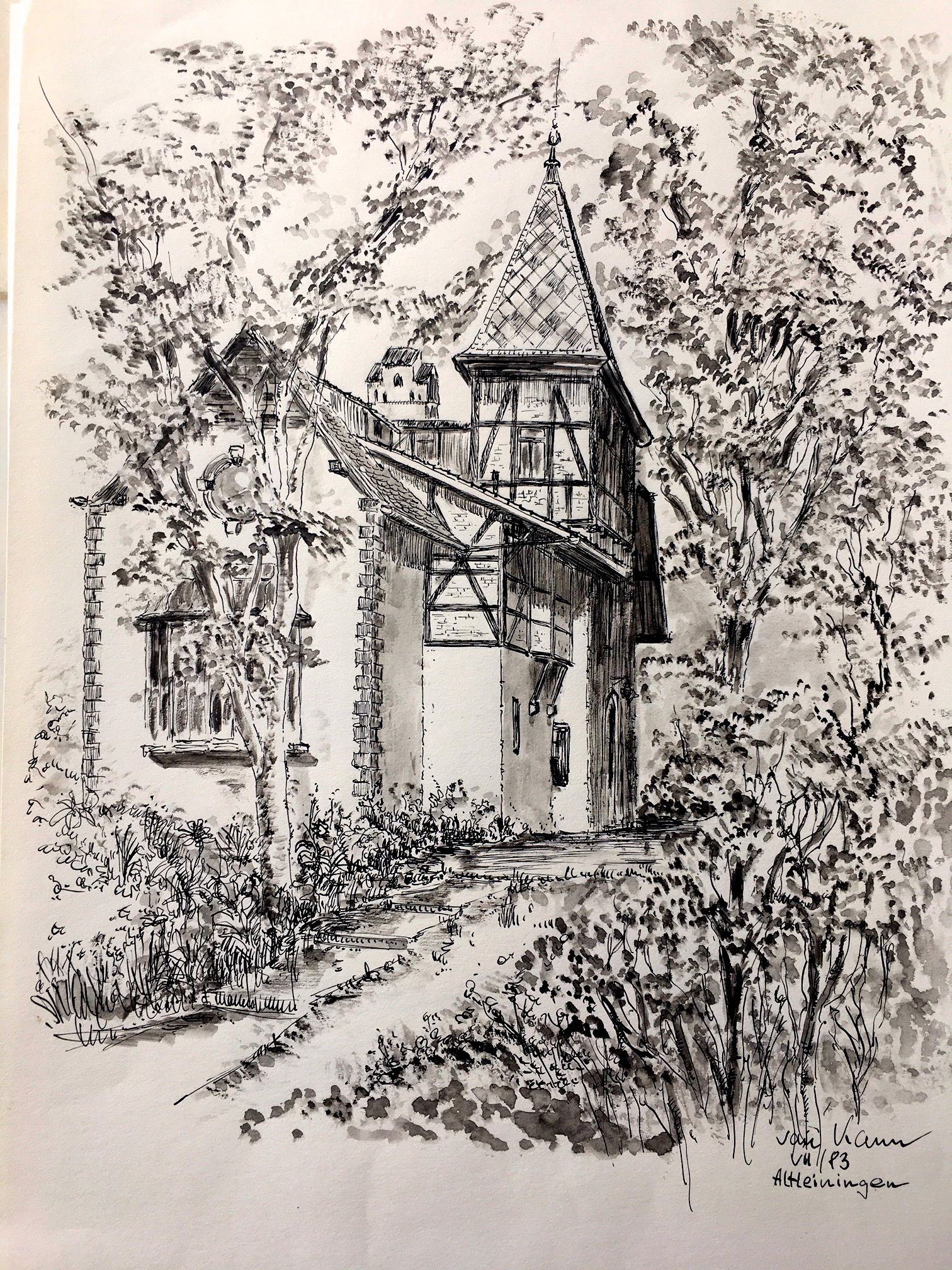 Ich skiz­zie­re vor Ort, zeich­ne dann in Tusche und kolo­rie­re. Oft habe ich zu meiner Freude Zuschau­er, die sich kri­tisch lobend äußern und mir Ansporn geben. Beson­ders dank­bar bin ich meiner Frau, die wäh­rend meiner „Sit­zun­gen“ an meiner Seite aus­hält und nicht nur lobt.