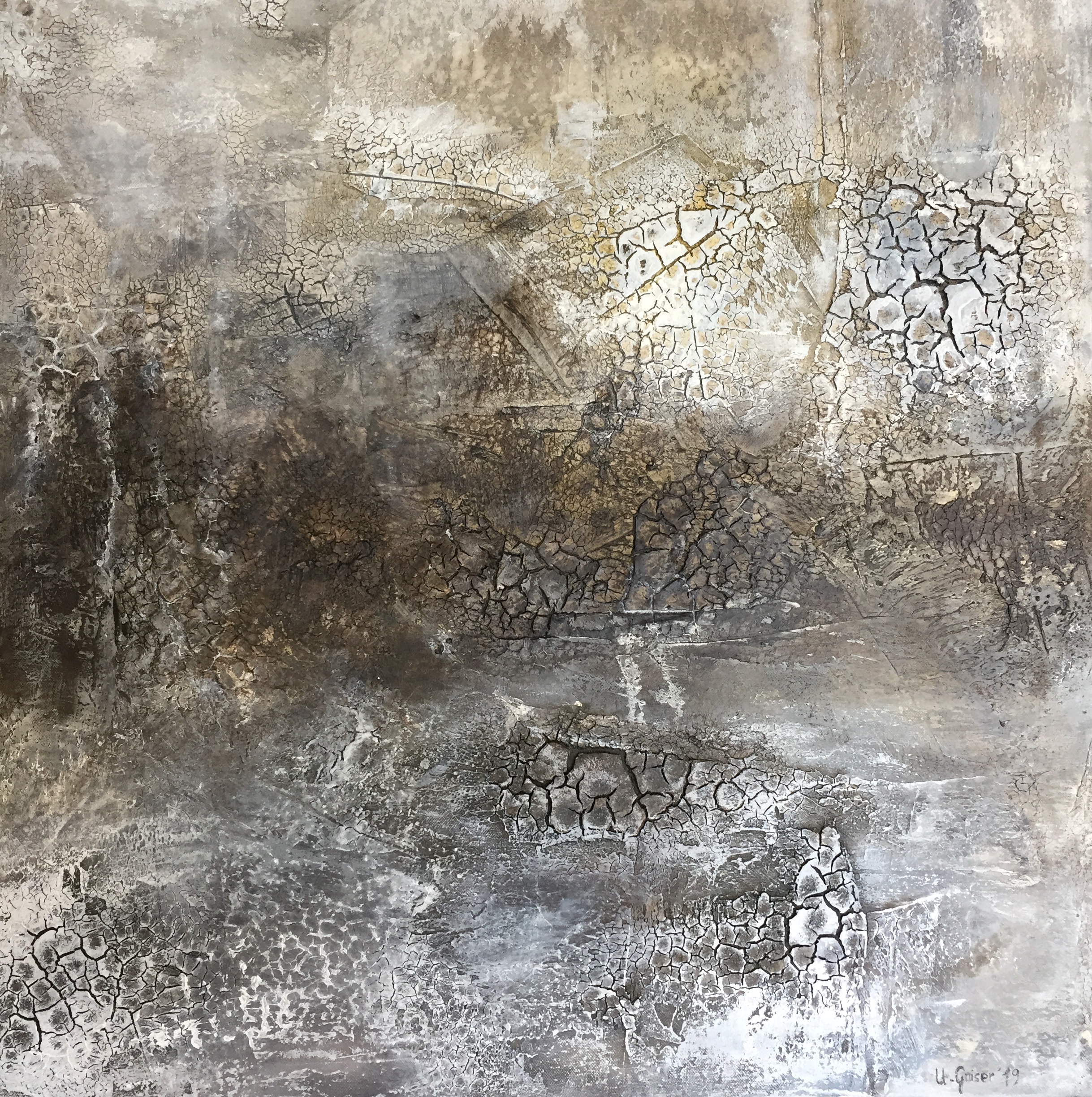 Mit unterschiedlichen Materialien wie Sand, Steinmehl, Papier, Asche, Pigmenten oder Rost erzeugt sie vielfältige Strukturen, die die Bildoberfläche beleben und neue Ebenen entstehen lassen. Rissbildungen erinnern an Baumrinden, ausgetrocknete Böden oder alte Wände. Durch das Einarbeiten von Collagematerial und kalligrafischen Elementen setzt sie Akzente, die bewusst im Kontrast zur gegenstandslosen Bildgestaltung stehen und zusätzlich Spannung erzeugen.